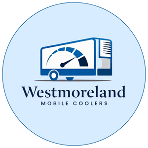 Logo for Westmoreland Mobile Coolers featuring a blue and white cooling unit with a gauge indicating cold temperature.